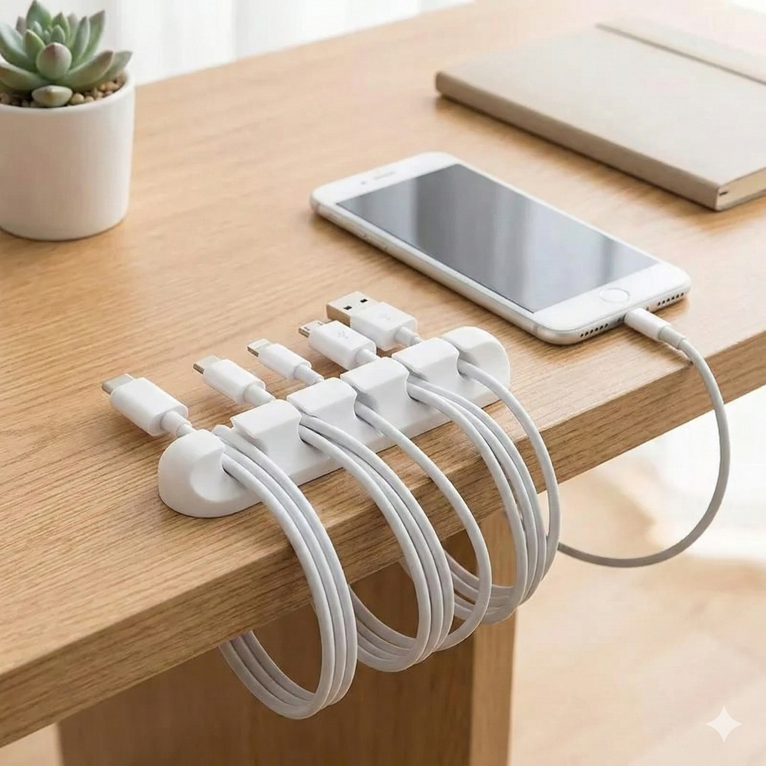 Keep your workspace clean and organized with this flexible silicone cable holder. Designed to secure multiple charging cables. Prevents them from tangling or slipping off your desk